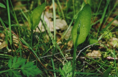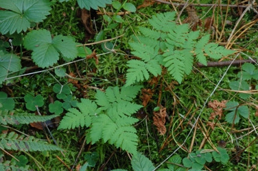 Der Eichenfarn (unten) entzieht sich dem Blick dadurch, dass er sich mit Vorliebe in Brombeer-Dickichten versteckt. Nicht leichter ist die Natternzunge (rechts) zu entdecken. Mit einer maximalen Wuchshöhe von nur 10-12 cm wird sie schnell übersehen. Ihre Bestände sind noch recht zahlreich im NSG "Dammer Bergsee".