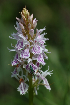 Fast weiß und mit violetten Zeichen versehen sind die Blüten des Fuchs-Knabenkrautes. Sie ist die seltenste Orchideenart innerhalb des NSG. Sie findet sich auf kalkreichen Böden im Bereich der Abraumhalde.